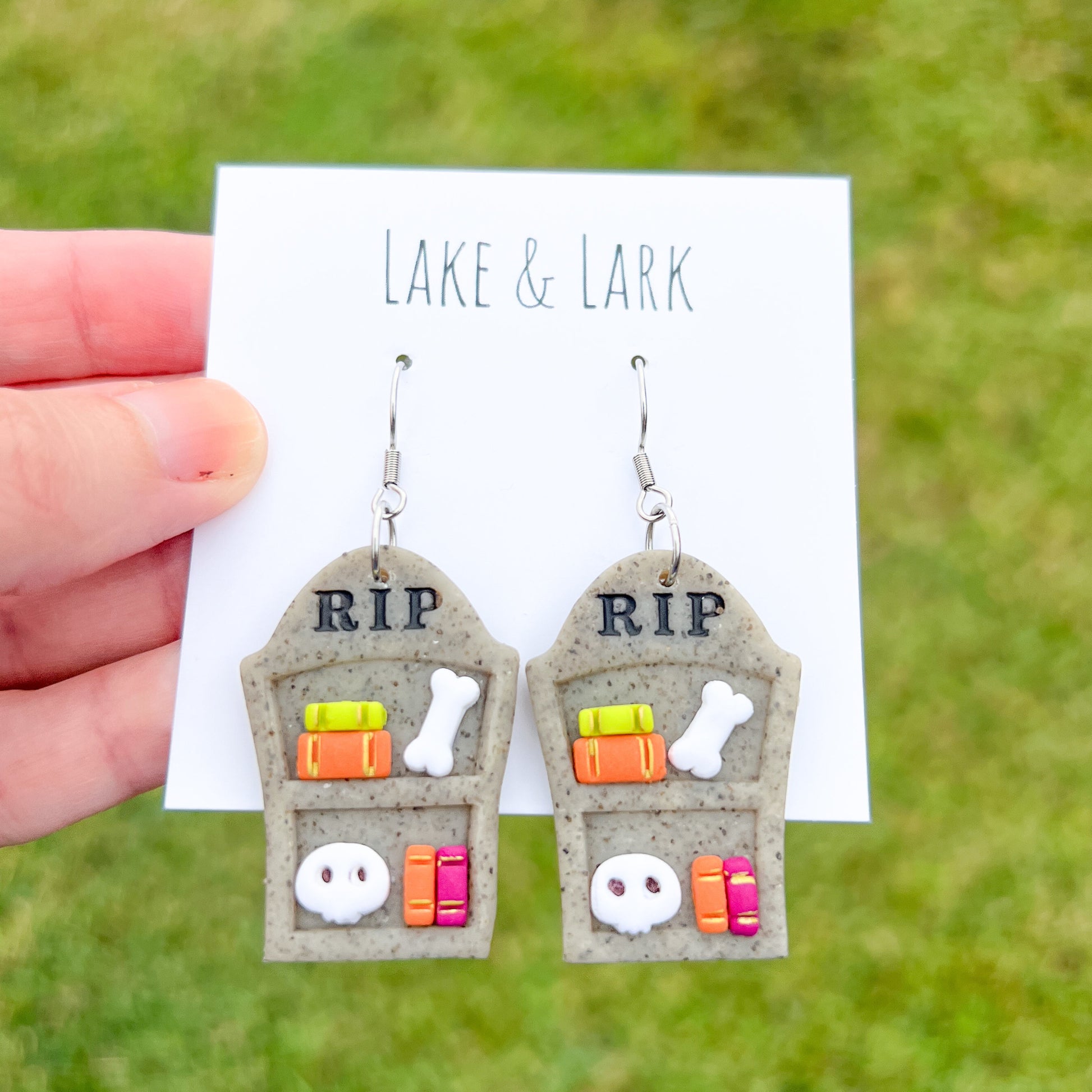 Tombstone Bookshelf Halloween Earrings – Handmade Polymer Clay Jewelry